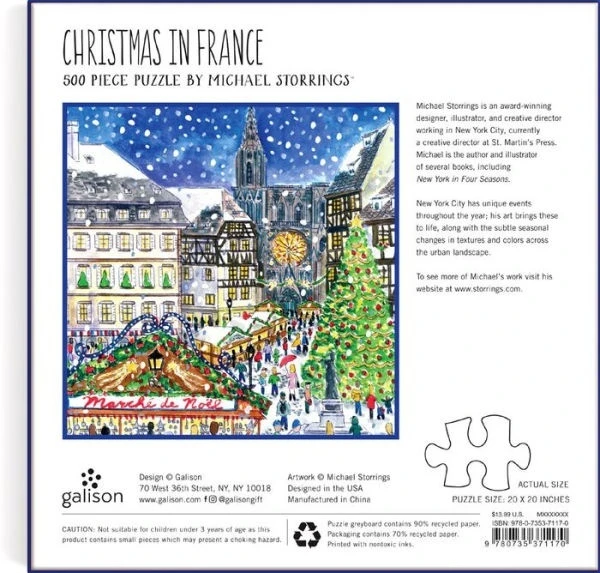 Piece together a whimsical Christmas scene with this 500-piece puzzle from Galison. Award-winning designer, illustrator, and creative director Michael Storrings beautifully captures the wonder and joy that can be found in France during the winter holiday season. Galison puzzles are packaged in matte-finish sturdy boxes, perfect for gifting, reuse, and storage. An insert of the full puzzle image is also included.